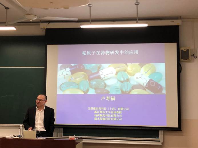 应太阳集团9728邀请,上海艾琪康医药科技有限公司总裁卢寿福博士于10月25日15:30在七教101为太阳集团9728和化学院师生做了题为“氟原子在药物研发中的应用”的学术报告。报告会由邓卫平教授主持。