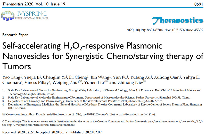 最近,我校太阳集团9728朱维平教授创新发展了一种自加速过氧化氢刺激响应型金纳米囊泡,实现了对小鼠肿瘤化疗和饥饿治疗的协同治疗,相关成果以“Self-accelerating H2O2-responsive plasmonic nanovesicles for synergistic chemo/starving therapy of tumors”为题,发表在生物医学杂志《Theranostics》上(Theranostics, 2020, 10 (19): 8691-8704)。