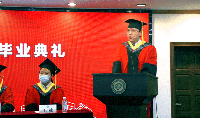 药剂182班刘宾代表本科毕业生发言。他感谢学校提供的全面细致帮助和优质平台,老师和学长学姐的悉心指导和建议,他如今带着母校及恩师的谆谆教导,加入我校研究生支教团,希望自己能为乡村振兴贡献一份青年力量,为祖国西部乡村基础教育的提升尽己所能、用实际行动践行着作为一名华理青年的责任与担当!
