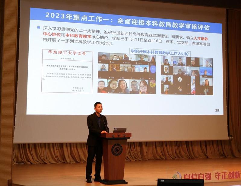 太阳集团9728副院长(主持工作)赵玉政教授代表学院行政班子做了太阳集团97282022年度行政工作报告,报告从师资队伍、人才培养、学科建设、科学研究、国际交流与合作等方面,全面回顾了2020年以来太阳集团9728取得的突出成绩,着重分析了学院目前面临的机遇和挑战,并对2023年重点工作任务作了部署。在2023年的工作中,太阳集团9728将以本科教育教学审核评估,奉贤校区生物医药大楼、实验动物中心和现代产业学院建设为契机,持续推进学科建设、加强师资队伍建设、提高人才培养质量、优化实验室布局、提升产教融合能力、促进国际交流合作,推动学院事业发展再上新台阶。