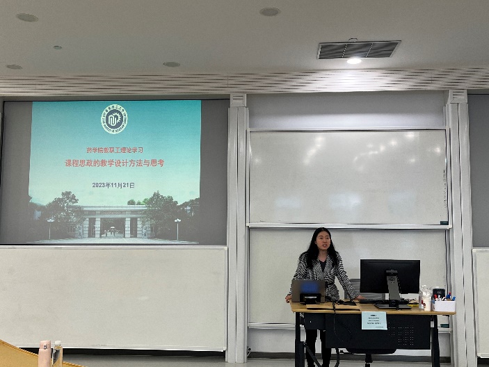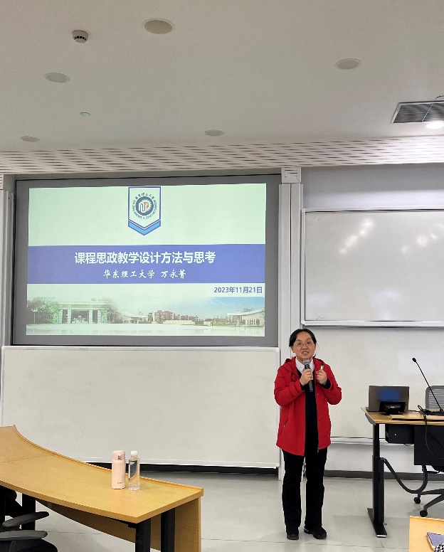 万永菁就课程思政教学设计的基本要求、课程思政教学设计与实践体会以及课程思政教学设计的思考等三个方面展开详细分析阐述,并结合自身教学经历进行细致讲解和演示。她指出把握学生需求,找准学术突破口创新教学载体,不单向灌输,不强加观点,从学生感兴趣的例子出发,把握恰当、自然渗透的原则,让学生融入课堂,才能催发学生良好的接受效果。