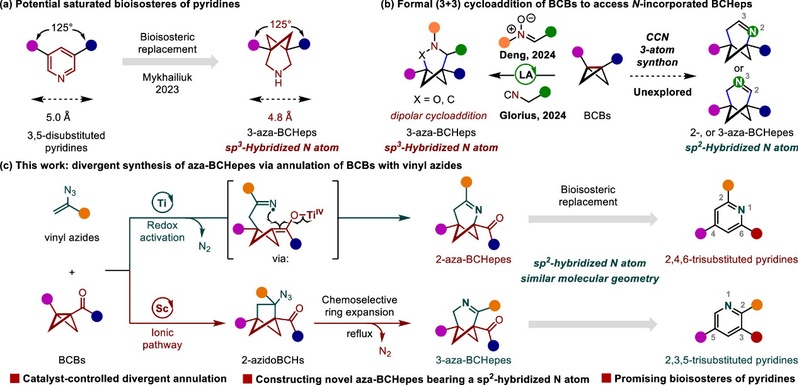 近年来,在“逃离平面”药物设计概念的引导下,笼状小分子例如双环[1.1.1]戊烷 (BCP),双环[2.1.1]己烷 (BCH) 和双环[3.1.1]庚烷 (BCHep) 被用作苯环的3D生物电子等排体,在提高候选药物的理化性质方面有着重要的应用。同时,吡啶是FDA批准药物中第二常见的氮杂环,目前已知有7000种以上的生物活性分子和10%的上市药物都含有吡啶结构。然而,这种生物电子等排策略应用于吡啶生物电子等排体的探索鲜有报道。2023年,Mykhailiuk课题组开发一类吡啶的3D生物电子等排体—氮杂双环[3.1.1]庚烷 (3-aza-BCHep),其修饰的药物分子卢帕他定类似物与母体药物相比具有更好的理化性质和代谢稳定性(图1a)。最近,邓卫平课题组和Glorius课题组分别报道了两例Lewis酸催化的BCBs参与的 (3 + 3) 偶极环加成反应,构建了一系列含有sp3杂化氮原子的3-氮杂[3.1.1]庚烷化合物(图1b)。由于吡啶结构中的sp2杂化氮原子含有非共轭的孤对电子,以及C=N双键上具有π电子,这些结构特征影响着碱性以及与目标蛋白分子之间的结合能力,氮原子的杂化态是探索吡啶的生物电子等排体的重要考量。从这些方面考虑,含有sp2杂化氮原子的双环[3.1.1]庚烯结构 (aza-BCHepes) 可以更好地模拟吡啶。然而由于结构的刚性以及亚胺的稳定性等因素,合成含有sp2杂化氮原子的氮杂[3.1.1]庚烯骨架是具有挑战的,目前尚无这类结构的合成报道。因此,开发高效的催化策略以快速地获得新型氮杂双环[3.1.1]庚烯骨架在药物创新中具有重要价值。