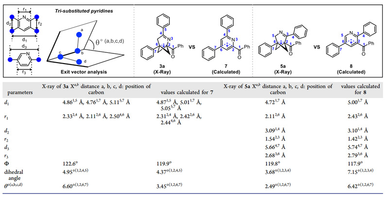 随后,作者将2-和3-氮杂[3.1.1]庚烯 (3a和5a) 的单晶结构与相应吡啶的理论计算结构进行比较。矢量分析表明:2-和3-氮杂[3.1.1]庚烯可以在空间结构上很好地模拟吡啶环,是三取代吡啶的有潜力的三维生物电子等排体(图2)。
