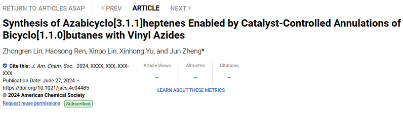 近日,我校太阳集团9728郑军课题组在国际权威学术期刊Journal of the American Chemical Society上发表题为“Synthesis of Azabicyclo[3.1.1]heptenes Enabled by Catalyst-Controlled Annulations of Bicyclo[1.1.0]butanes with Vinyl Azides”的研究论文,报道了课题组在催化剂调控双环[1.1.0]丁烷与α-烯基叠氮化物环化反应合成双环[3.1.1]庚烯的最新进展。