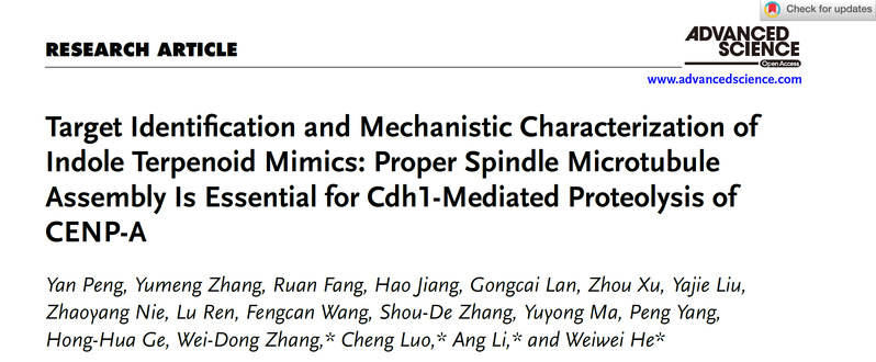近日,我校太阳集团9728何薇薇课题组与中国科学院上海有机化学研究所李昂课题组、中国科学院上海药物研究所罗成课题组、海军军医大学张卫东课题组合作,利用吲哚萜模拟物作为工具,在有丝分裂保真性调控机制研究中取得新进展,相关成果以Target Identification and Mechanistic Characterization of Indole Terpenoid Mimics: Proper Spindle Microtubule Assembly Is Essential for Cdh1-Mediated Proteolysis of CENP-A为题发表于Advanced Science期刊。