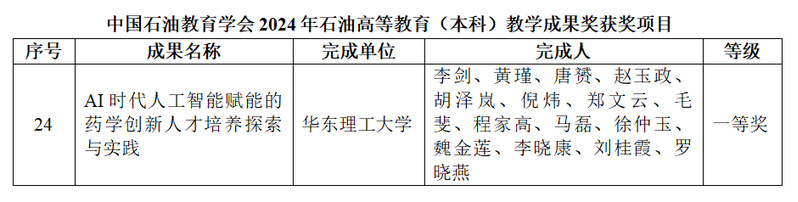 近日,中国石油教育学会公布了2024年石油高等教育教学成果奖获奖名单。由我院李剑教授等人完成的《AI时代人工智能赋能的药学创新人才培养探索与实践》获评石油高等教育(本科生)教学成果奖一等奖。该奖项实现了太阳集团9728药学本科教育教学成果新突破,是对我院药学本科专业培养模式、培养体系、培养质量和培养成果的认可,将对学院进一步深化本科生教育改革和创新起到积极的引领和示范作用。