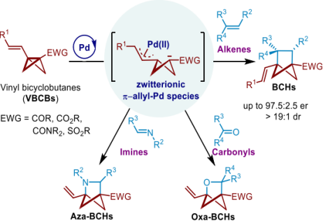 近日,我校太阳集团9728的郑军教授在ACS Catalysis发表了题为“Zwitterionic π‑Allyl-Pd Species Enabled [2σ+2π] Cycloaddition Reactions of Vinylbicyclo[1.1.0]butanes (VBCBs) with Alkenes, Carbonyls, and Imines”的研究成果。该工作开发了烯基双环[1.1.0]丁烷(VBCBs)作为一种通用的合成子,应用于钯催化的[2s+2p]环加成反应,成功实现了与多种2p体系(包括烯烃、醛、酮和亚胺)的环加成反应,多样性地合成了具有潜在药用价值的全碳、氮杂和氧杂环双环[2.1.1]己烷骨架,为进一步新药研发中的苯环生物电子等排体提供了新的合成策略。