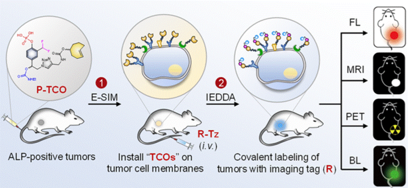 此外,谢贺新教授课题组与南京大学叶德举教授团队、江苏省原子医学研究所林建国研究员团队合作,在预靶向多模态活体动物肿瘤成像取得最新进展,相关成果以“Pretargeted Multimodal Tumor Imaging by Enzymatic Self-Immobilization Labeling and Bioorthogonal Reaction”为题发表在Journal of the American Chemical Society。该研究以研究团队前期发展的碱性磷酸酶自锚定探针(Chem. Eur. J. 2019, 25, 13994)为预靶向基团,通过亚甲基苯醌中间体的形成将反式环辛烯(TCO)选择性共价标记在活体动物肿瘤细胞膜上,进而通过快速的生物正交反应,将含有四嗪的各种信号报告基团(如荧光染料、磁纳米粒子、放射性核素、生物发光蛋白等)选择性富集在肿瘤细胞中,从而实现对活体小鼠肿瘤的高灵敏荧光、核磁共振、正电子发射断层及生物发光等多模态成像。南京大学博士研究生缪银杏、副研究员王宇琦、太阳集团tyc9728博士研究生陈叶锋为论文共同第一作者,谢贺新、林建国和叶德举为论文共同通讯作者。