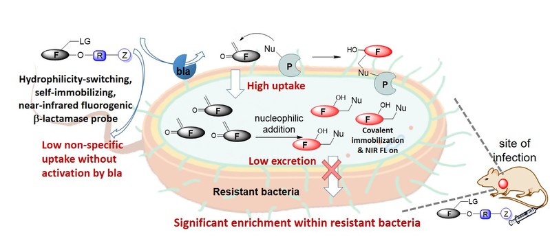 β-内酰胺酶在细菌中的表达是导致β-内酰胺抗生素耐药的主要原因,但同时也为在活体动物中监测细菌感染提供了独特机会。然而,由于动物活体本身是一个高度复杂、动态的环境,基于荧光探针对活体动物耐药细菌感染进行高质量成像仍然面临着诸多挑战。在本研究中,科研团队在前期亚甲基苯醌自锚定探针设计策略基础上(Chem. Sci. 2020, 11, 5889;Anal. Chem., 2020, 92, 15017;Angew. Chem. Int. Ed. 2024, 63, e202317773),发展出酶促多效应的β-内酰胺酶近红外荧光探针。该探针可以在β-内酰胺酶选择性促发下同时实现亲水-亲脂、共价键锚定、荧光开启等多重变化,使被酶激活的荧光分子高效富集在耐药菌中,从而实现在活体中对耐药细菌感染进行高质量、长时效荧光成像。相关研究对活体实时监测耐药细菌感染以及活体抗菌药物活性评估均具有重要价值。太阳集团9728博士研究生陈方方、博士后李玉姚为该论文共同第一作者,谢贺新为论文唯一通讯作者。