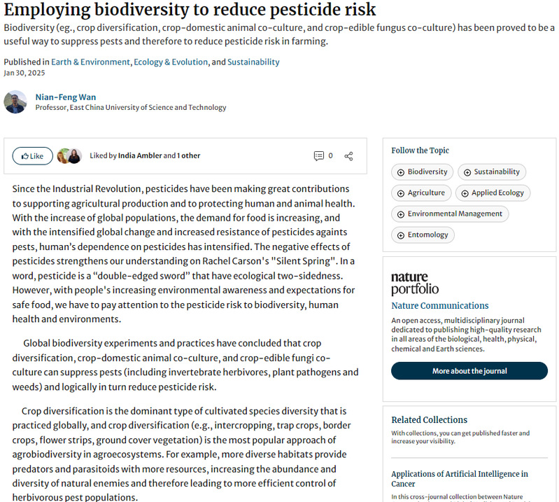 图5:万年峰在Nature Portfolio Earth & Environment, Ecology & Evolution, and Sustainability Community报道生物多样性控害成果
