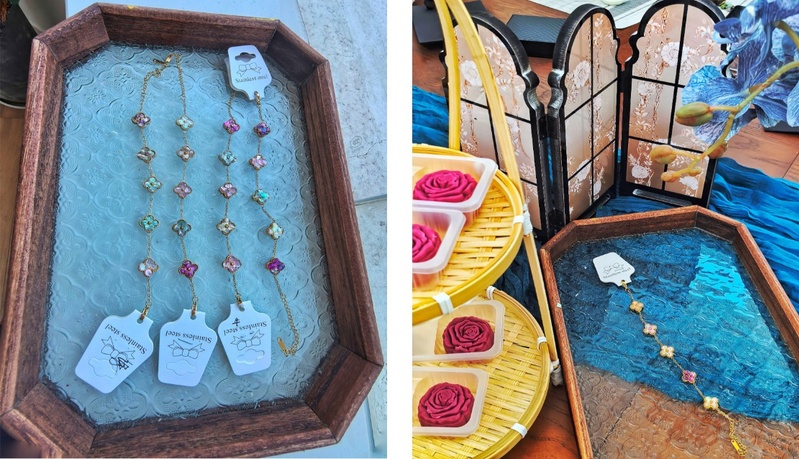 活动中,手作专家耐心讲解了手链制作流程与技巧,大家认真聆听后,迅速投入实践。女教师们小心拿起贝壳,专注地镶嵌在手链上,充分发挥创意,设计出独特图案,有的排列成花卉造型,有的拼接成简约几何图案。制作期间,女教师们相互交流心得,分享镶嵌手法与图案构思,现场氛围热烈温馨。