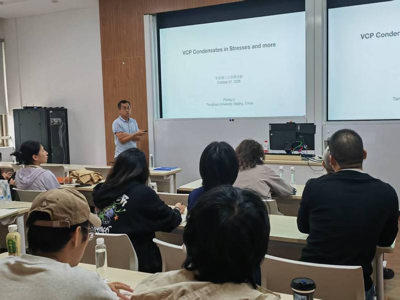互动环节中,师生们积极踊跃,就VCP凝聚体的药物调控潜力、相分离液滴异质性等一系列前沿且关键的问题向李丕龙研究员提问。李老师以深厚的学术功底和丰富的实践经验,对每一个问题都进行了细致入微、深入浅出的解答。此次报告内容丰富、见解独到,兼具深度与广度。李丕龙研究员的精彩分享不仅为药物研发提供了新的思路和方法,也为生命科学研究的进一步深入开展带来了重要启发。