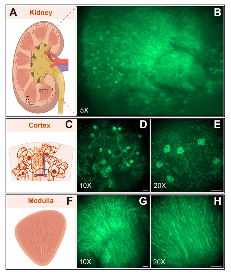 这类超吸收花菁染料具有高亮度、高稳定性、高生物相容性的特点,为高散射介质(如动物组织)的高分辨率三维成像提供了新工具。研究团队利用染料7对小鼠肾脏进行成像,不仅能区分皮质、髓质等大区域,更能精确测量出肾小球、肾小管壁乃至内部毛细血管的微观尺寸。并且通过三维重建,观察到的肾小球毛细血管网络和进出球动脉血管壁等精细结构。